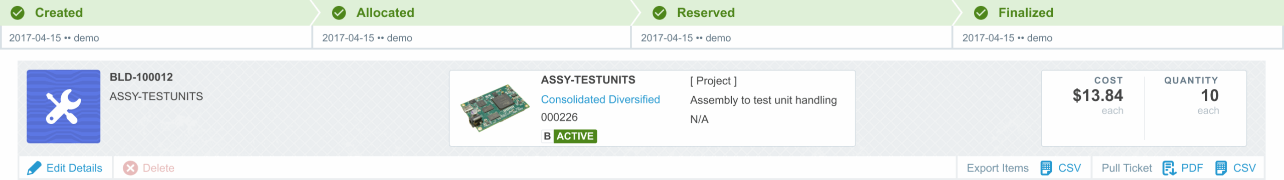 After completion, a permanent record of the consumption remains for review. The dates on which the build was created, allocated, reserved, and committed are stored as well as the quantity and the total build cost for each unit.